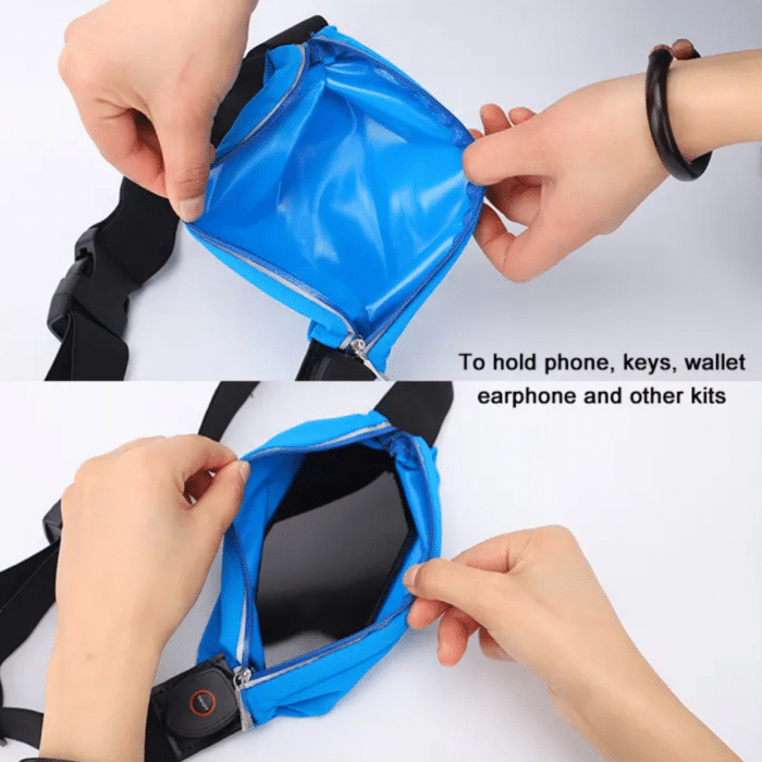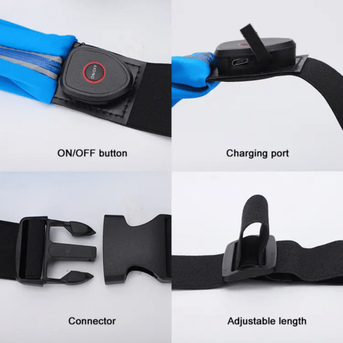 This LED rechargable waist bag is designed for nighttime outdoor activities, this waist bag enhances your safety with built-in LED lights, ensuring you’re seen in the dark. Its spacious design accommodates essentials like your phone, wallet, glasses, earphones, keys, and more.